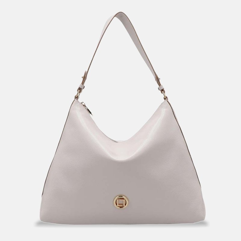 A bolsa apresenta textura suave com granulação leve que valoriza as linhas fluídas do modelo. A alça larga com ferragens metálicas traz presença visual e reforça o caráter moderno da peça. O detalhe metálico frontal adiciona elegância ao design, enquanto o caimento orgânico da parte superior cria um visual contemporâneo e harmonioso.