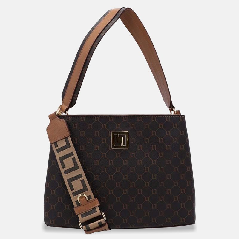 Design: Formato médio estruturado com estampa monograma e logo metálico em destaque