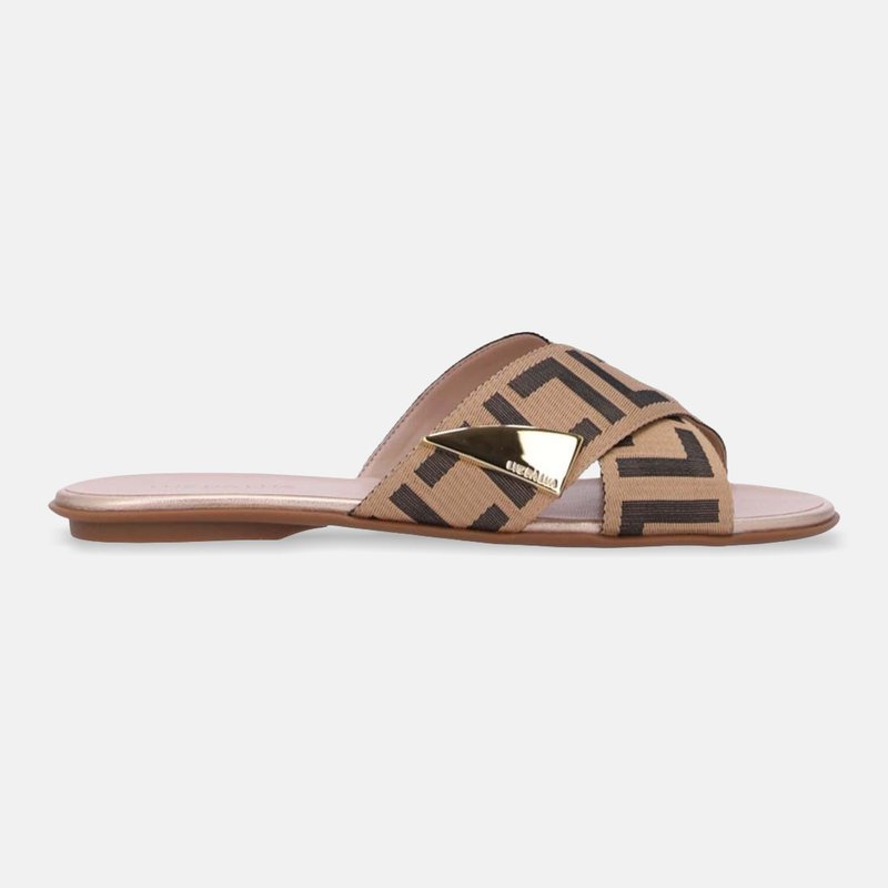 As tiras cruzadas em gorgurão destacam o monograma com textura marcante, trazendo identidade e modernidade ao modelo. O detalhe metálico dourado adiciona um toque sofisticado ao design, enquanto as linhas limpas e a estrutura leve reforçam a estética contemporânea e elegante do chinelo.