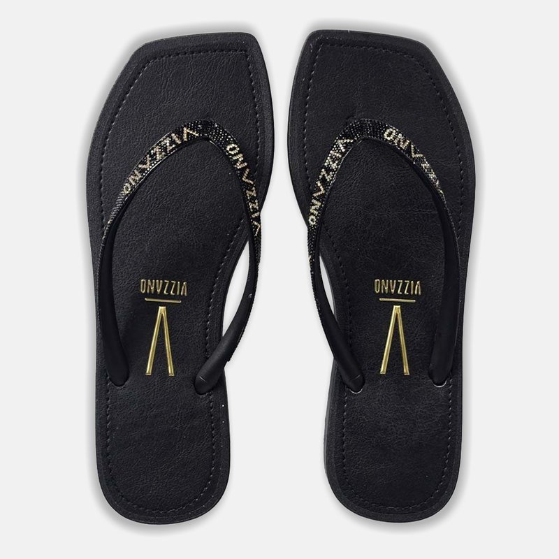 O Chinelo Vizzano Rasteiro Tira Fina Metalizado Preto - 6531.105.30158 combina bico quadrado, palmilha macia e tiras finas com logo em dourado, criando um chinelo flat leve, moderno e prático para acompanhar produções casuais com conforto ao longo do dia.
