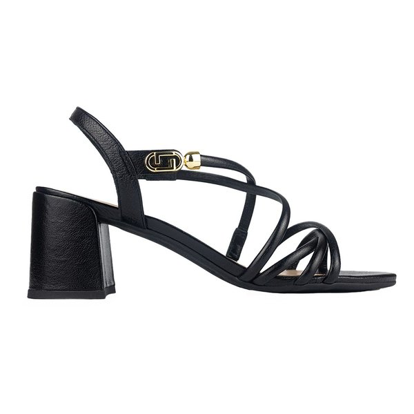 Sandália preta com tiras finas, salto bloco médio e fivela dourada lateral. Ideal para ocasiões especiais ou produções modernas do dia a dia.