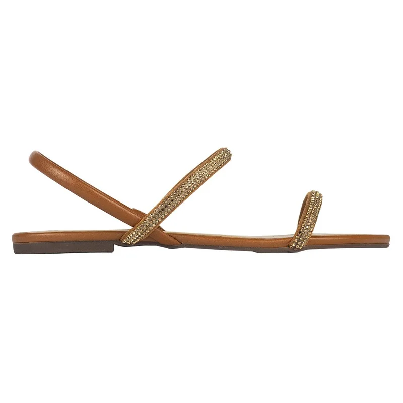 Sandália rasteira de tiras finas com aplicações de brilho, ideal para elevar produções do dia a dia sem perder a leveza. O visual minimalista alonga o pé, enquanto a palmilha macia e o solado estável garantem conforto no caminhar. Versátil, transita do jeans ao vestido e acompanha do passeio à noite casual.