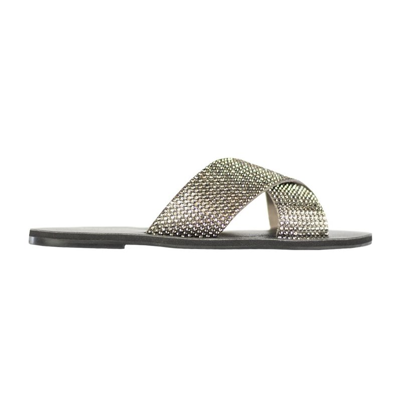 Rasteira com tiras largas cruzadas e aplicação de brilho que eleva produções casuais sem perder a leveza. O formato flat e a palmilha macia garantem conforto para o dia a dia, enquanto o solado estável oferece segurança ao caminhar. Versátil, transita do jeans ao vestido e vai bem do passeio à noite casual.
