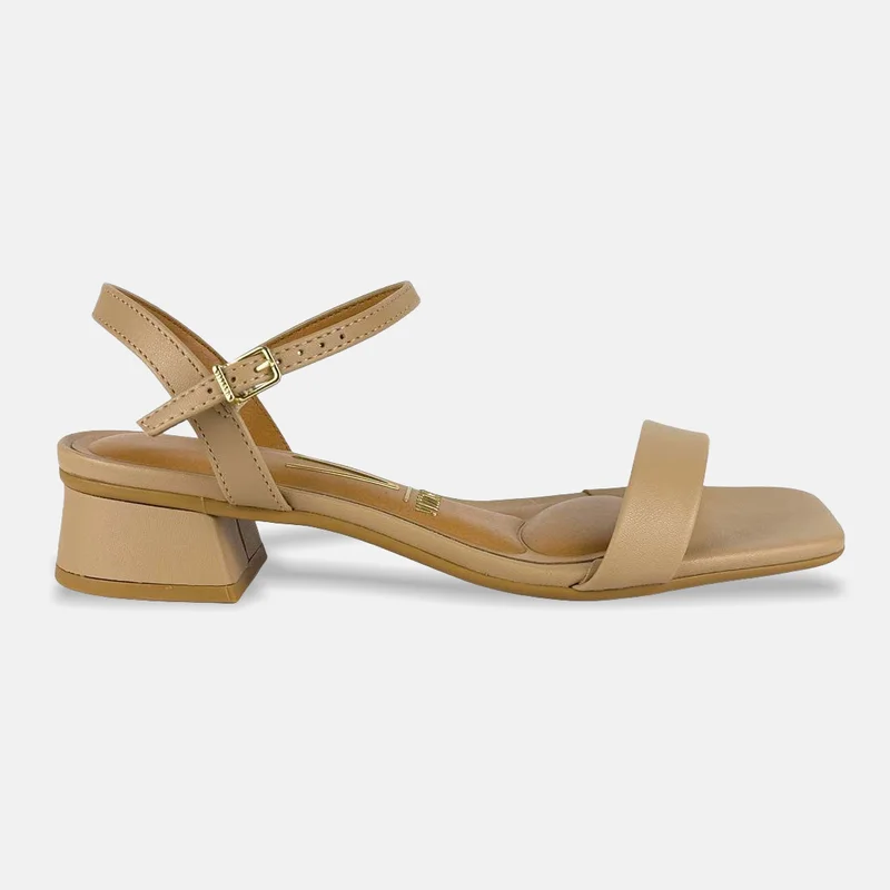 O modelo apresenta tiras bem posicionadas, com faixa frontal que abraça os dedos e tiras superiores que cruzam o dorso do pé até o tornozelo, criando um desenho leve e sofisticado. A fivela metálica lateral adiciona um toque delicado e reforça a sensação de ajuste sob medida. A palmilha clara, de formato anatômico e com acolchoado na área de maior apoio, em conjunto com o salto bloco baixo revestido e o solado em tom neutro, resulta em uma sandália de visual contemporâneo, discreto e fácil de coordenar com diferentes produções do dia a dia.