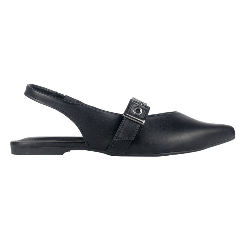 Sapatilha com a traseira aberta. Ajuste da tira traseira com um pequeno elástico. Detalhe de fivela frontal e bico fino