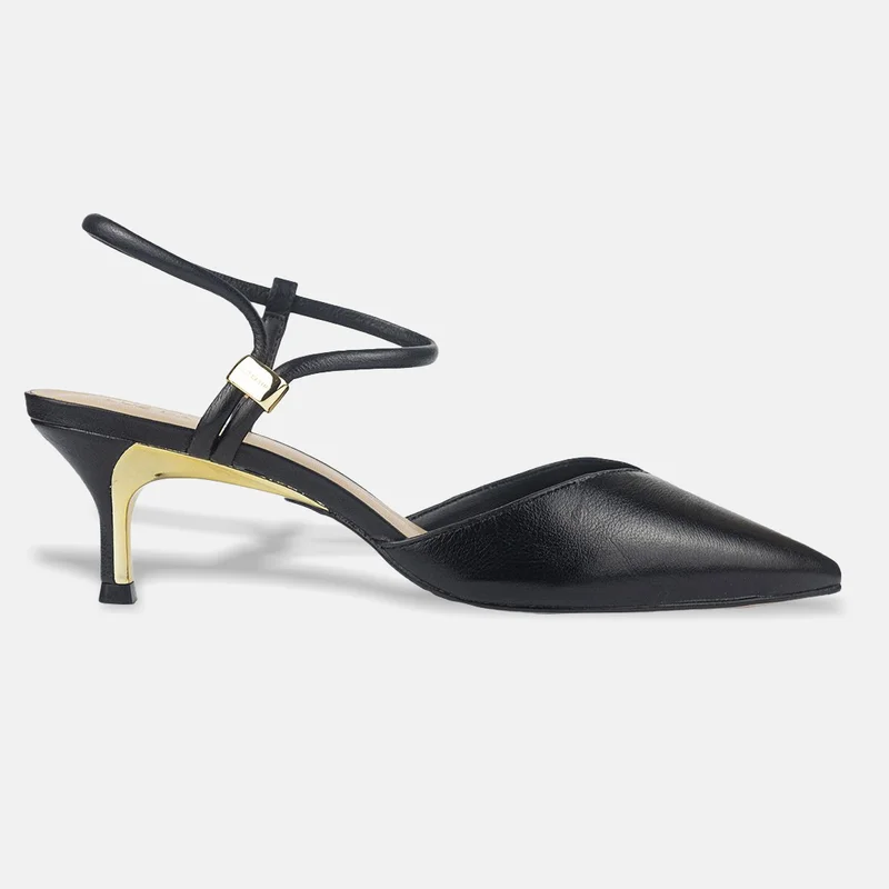 O Sapato Scarpin Luz da Lua Slingback Salto Baixo Preto 58060001 apresenta acabamento liso em couro, bico fino alongado e um elegante detalhe dourado no salto. O slingback com tira fina garante firmeza no calce, enquanto o salto baixo oferece equilíbrio e conforto para produções profissionais e sociais.