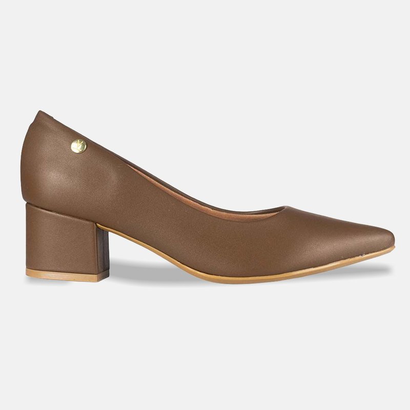 O Sapato Scarpin Vizzano Pelica Bico Fino Salto Bloco Marrom 1220.315.7286 combina bico fino elegante, linhas clássicas e salto bloco médio para entregar estabilidade, conforto e um visual sofisticado para o dia a dia, o trabalho e ocasiões especiais.