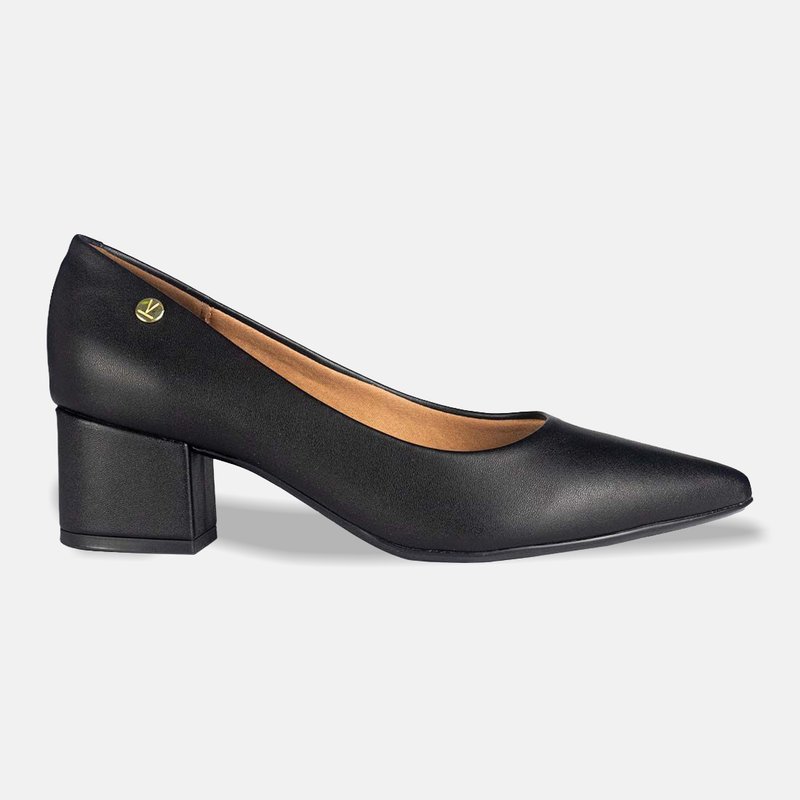 O Sapato Scarpin Vizzano Pelica Bico Fino Salto Bloco Preto 1220.315.7286 combina bico fino elegante, cabedal liso e salto bloco médio para garantir estabilidade, conforto e um visual sofisticado para o dia a dia, trabalho e ocasiões especiais.