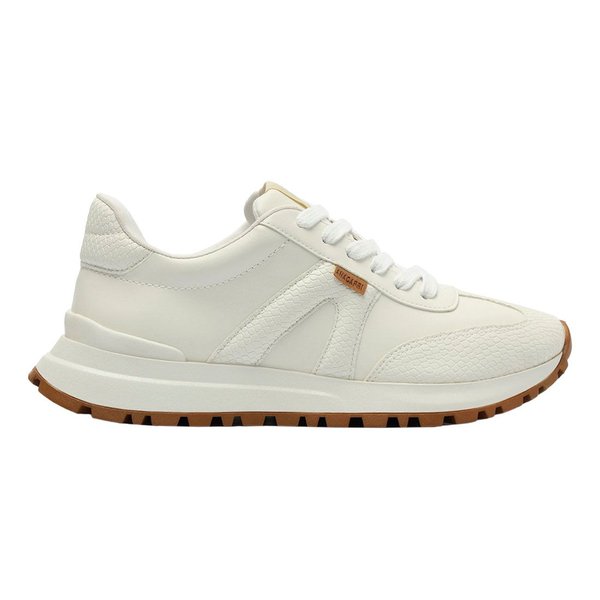 Tênis Miss Port com solado comfy esportivo e tratorado apresenta design de costura pesponto nas laterais e contornos, com recorte em peça em napa marrom aplicada na parte traseira e peças em suede branco aplicadas na lingueta, biqueira e parte traseira. De amarrar por atacadores, possui parte interna forrada. Com aplicação de peça recortada com design em A em napa e tag lateral Anacapri. Traz nova etiqueta tecida Anacapri branca, aplicada na lingueta.