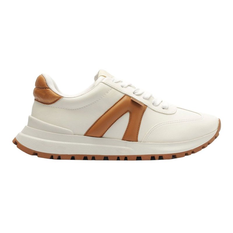 Tênis Miss Port com solado comfy esportivo e tratorado apresenta design de costura pesponto nas laterais e contornos, com recorte em peça em napa marrom aplicada na parte traseira e peças em suede branco aplicadas na lingueta, biqueira e parte traseira. De amarrar por atacadores, possui parte interna forrada. Com aplicação de peça recortada com design em A em napa e tag lateral Anacapri. Traz nova etiqueta tecida Anacapri branca, aplicada na lingueta.