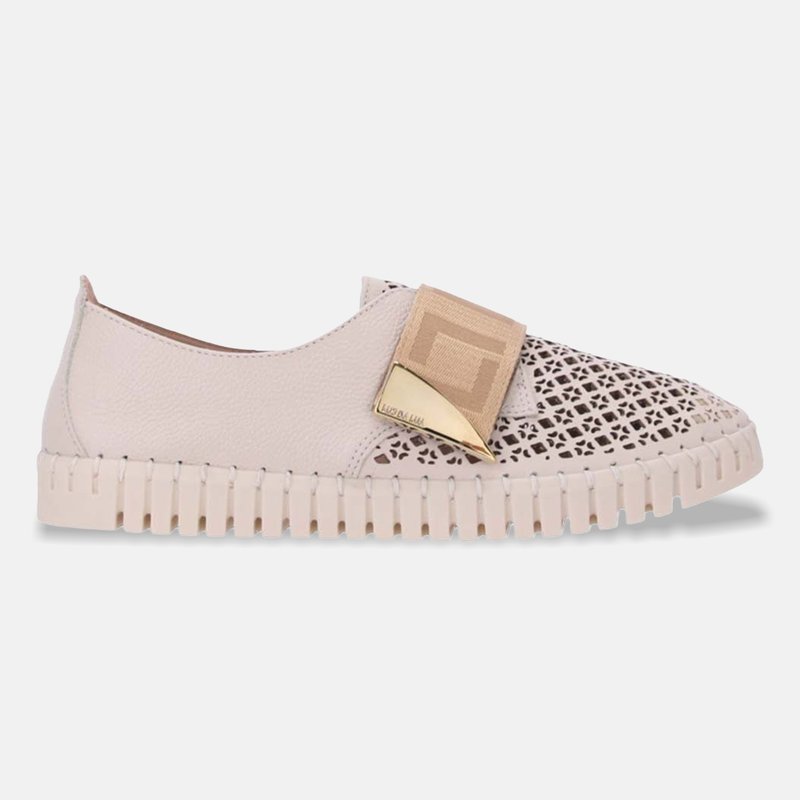 O acabamento em couro liso contrasta com a parte frontal vazada a laser, criando um desenho geométrico leve e sofisticado. A faixa em gorgurão com monograma LL e o aplique metálico dourado na lateral reforçam a identidade da marca e funcionam como ponto focal do visual. O solado recortado em tom claro completa o design com pegada esportiva casual e aparência moderna.