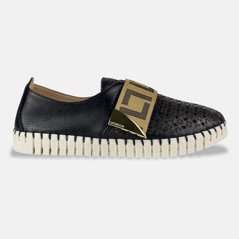 O Tênis Luz da Lua New Ridge Faixa Monograma Preto 60130042 combina cabedal vazado a laser, faixa monogramada e solado recortado para entregar conforto e estilo no uso diário. Com calce slip on e interior acolchoado, é ideal para compor looks urbanos sofisticados com praticidade.